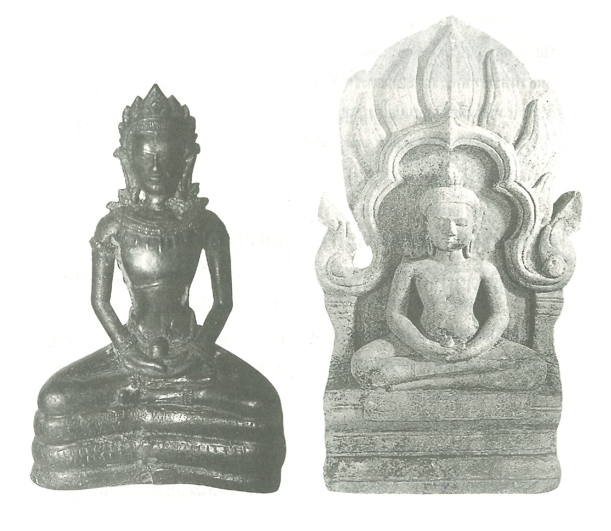 (ซ้าย) บันแถลงสลักภาพพระไภษัชยคุรุไวฑูรยประภา ที่พิพิธภัณฑสถานแห่งชาติพิมาย (ขวา) ประติมากรรมสำริดภาพพระไภษัชยคุรุไวฑูรยประภา ที่พิพิธภัณฑสถานแห่งชาติมหาวีรวงศ์